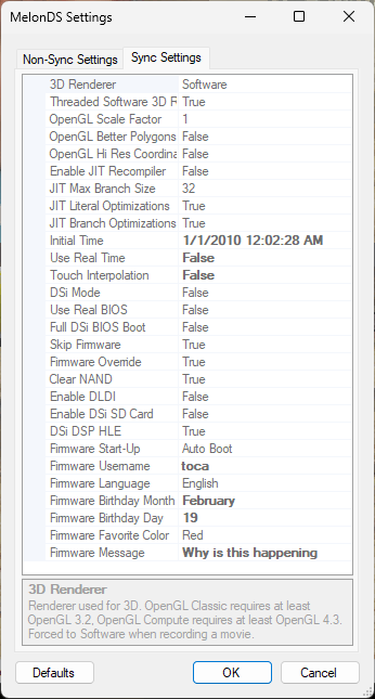 And here is an image showcasing my MelonDS Sync Settings. Most notably, “Touch Interpolation” has been turned off and initial time is set to 1/1/2010 00:02:28 AM.