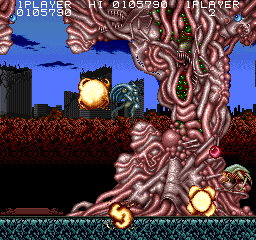 Act-Fancer: Cybernetick Hyper Weapon is a run and gun arcade game that was released by Data East. It is the third entry in the Evolution Trilogy and the sequel to both Darwin 4078 and SRD: Super Real Darwin. You play as a biomechanical being named SCI=VAX that can evolve into stronger forms by collecting orbs dropped by defeated enemies. Your mission is to stop a horde of alien bugs that have been accidentally dropped into a large civilian populace by a military plane. These bugs can assimilate and mutate any living being it comes in contact with and can spread quickly if unchecked. That's where SCI=VAX comes in to save the world and clean up the military's mistakes.