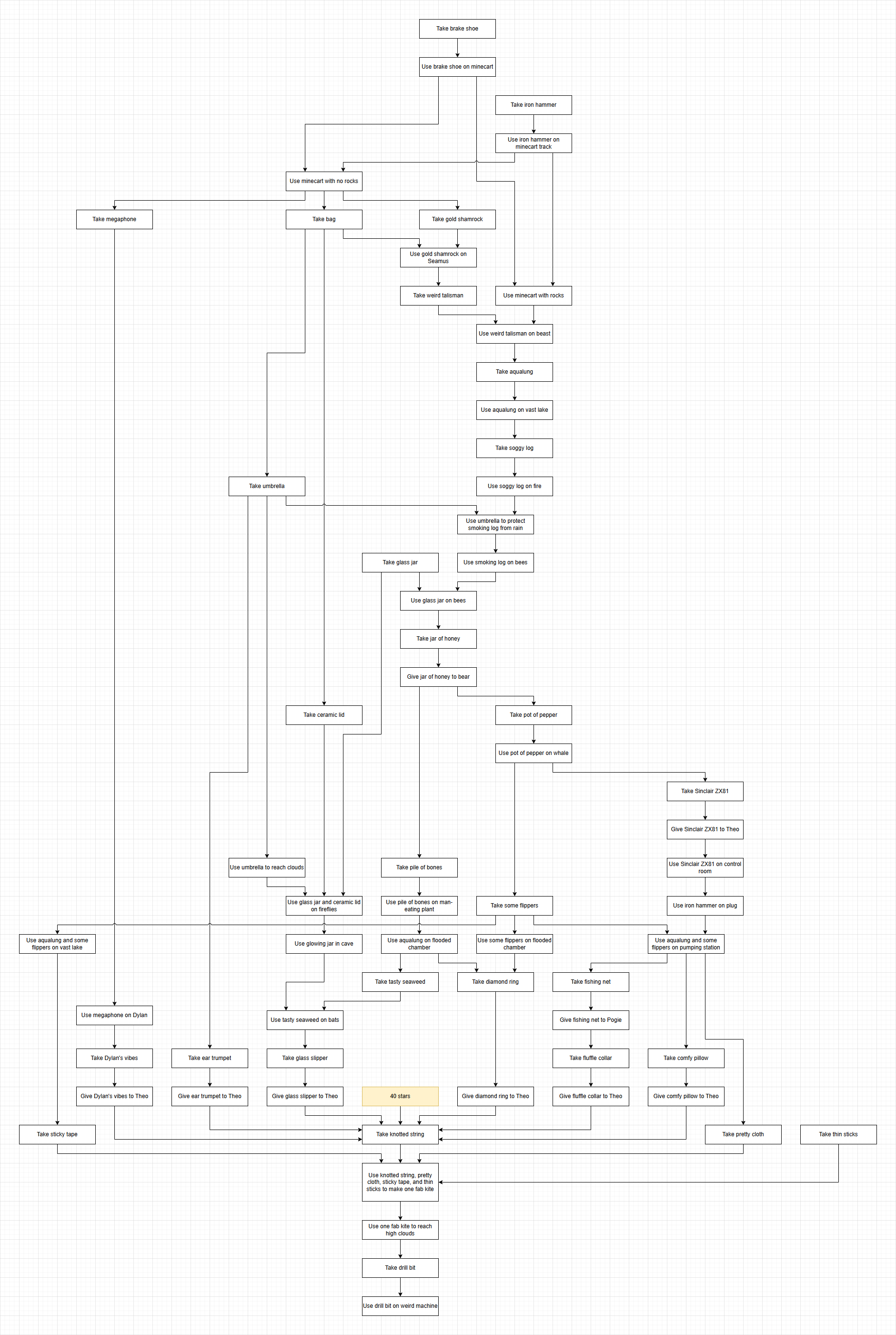 Back in the deep pit, we throw the fishing net at Pogie to get his collar, along with our final two crossings, our final two rocks, and the sticky tape, swapping it for the diamond ring. We give the comfy pillow, the diamond ring, and the fluffle collar to Theo, along with 15 stars, to rescue Dozy, Daisy, and Pogie, before Theo uses our final five stars to rescue himself, leaving us only with knotted string to remember him by. We combine the pretty cloth, the sticky tape, the thin sticks, and the knotted string to produce one fab kite, allowing us to float much higher in the windy shaft to pick up the drill bit, fitting it to the drill to finally escape the underworld.