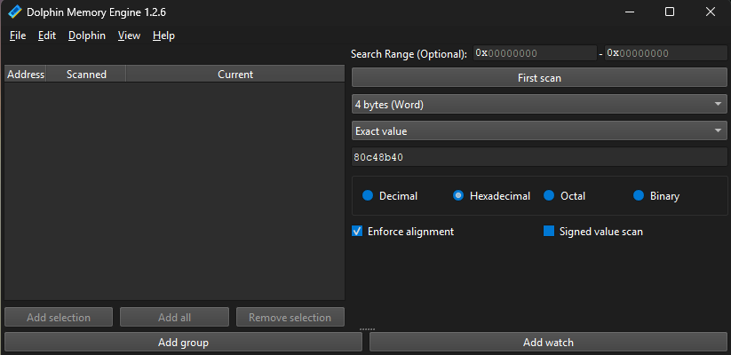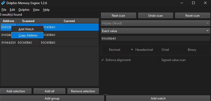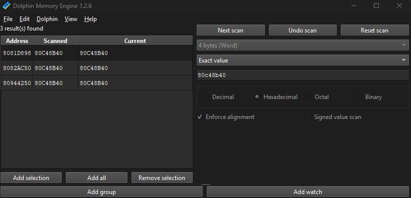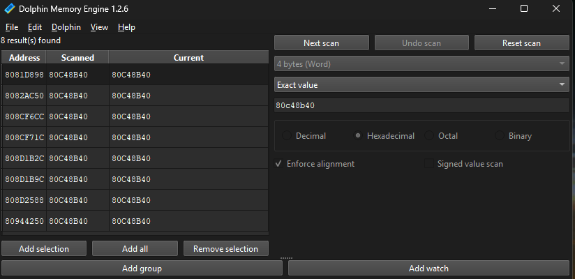 I'm using Dolphin 5.0-16391. I successfully hooked to a GC game, MMU is off. When I execute scans, no addresses pop up in the list. Is this engine better than Dolphin's Tools -> Cheat Manager -> Start New Cheat Search?