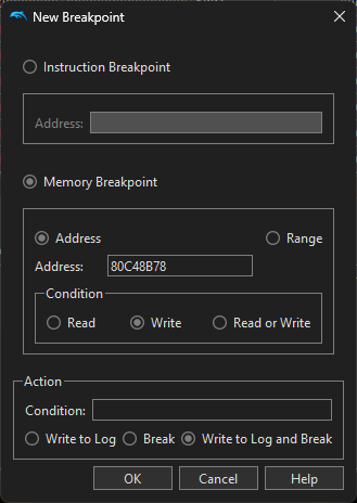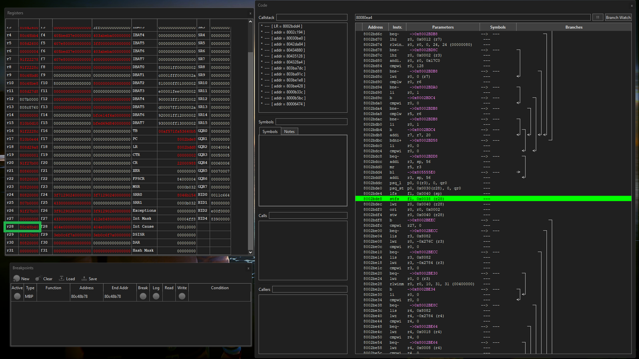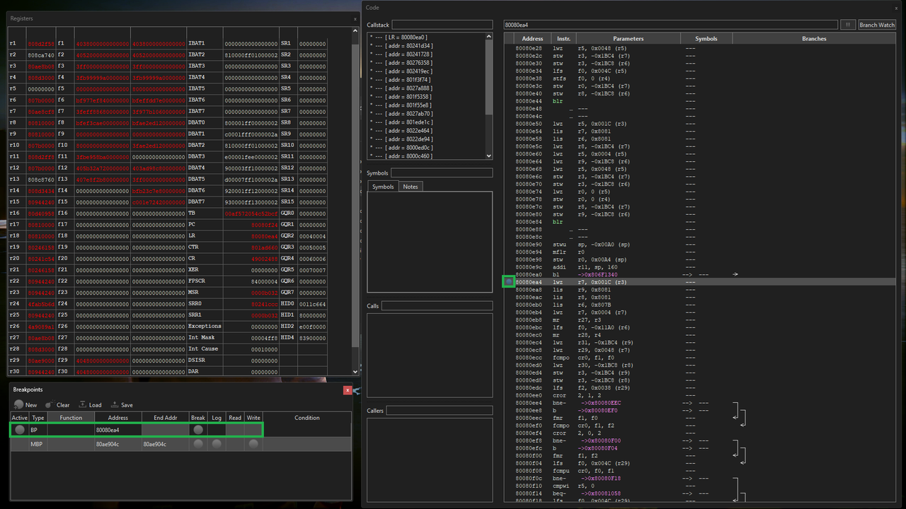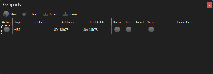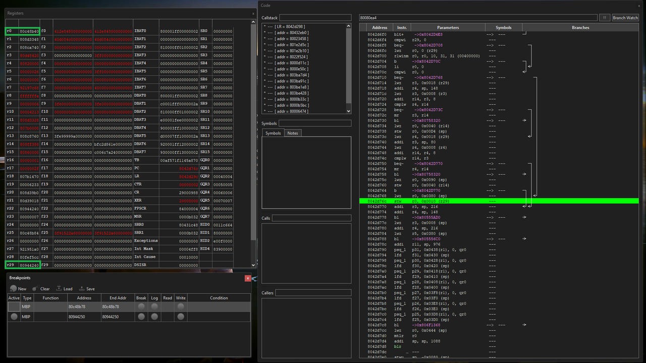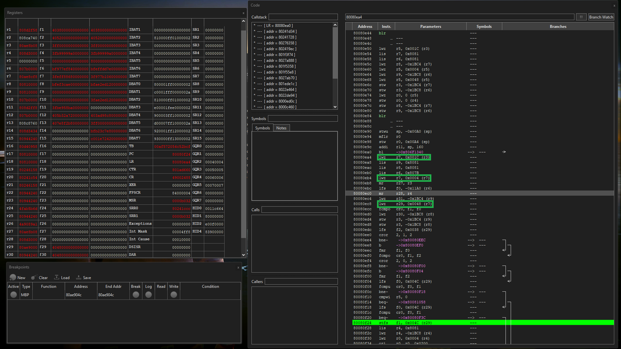 This should open an instance of Dolphin with some extra buttons (i.e., "Step", "Step Over", etc. to the left of "Open", "Refresh", ...). Alternatively, create a shortcut to Dolphin.exe, then right-click on that shortcut > Properties, and add " -d" to the end of the "Target" field. Click OK and double-click the shortcut to start Dolphin in debug mode. To search for pointers, we will need three extra windows from the "View" menu at the top of Dolphin: Click on View > "Code", "Registers", and "Breakpoints" 2. First pointer search I will assume that you have already found the RAM value that you want to find a pointer for. In this first example, I'll be searching for a stable pointer to the address 0x80C48B78, the Prince's z-coordinate in Prince of Persia: The Forgotten Sands (Wii), stored as a float. Recommendation: Set a savestate here where your RAM value works, so in case something doesn't go as planned you have a "known state" to return to. 2.1. Setting a memory breakpoint First, in the "Breakpoints" window click on "New" and select "Memory Breakpoint". Enter the address you want to find a pointer for (in our case 80C48B78). For "Condition" I went with "Write", but according to the original tutorial either read or write is fine. Click "OK". There should now be an entry of type "MBP" (memory breakpoint) in the "Breakpoints" window: Next, play the game until a change in the variable you're investigating is triggered. (In our example, we're looking for a pointer to a coordinate, so moving or jumping should do the trick). Once the game has tried to access the address, the breakpoint will trigger, meaning the emulation will pause and the "Code" window and the "Registers" windows will fill up with all kinds of information. What is relevant to us is the line in the "Code" window that is highlighted in green. Also, once this first breakpoint has triggered, deactivate it by clicking on the circle next to "MBP" in the "Breakpoints" window; the circle should then vanish and the line should be greyed out. 2.2. Intermission: Some important assembly commands Before continuing on with the highlighted instruction "stfs f1, 0x0038 (r28)", a quick glossary on the instructions you can encounter; you don't have to understand every aspect of it—what is important here is the basic distinction & syntax: