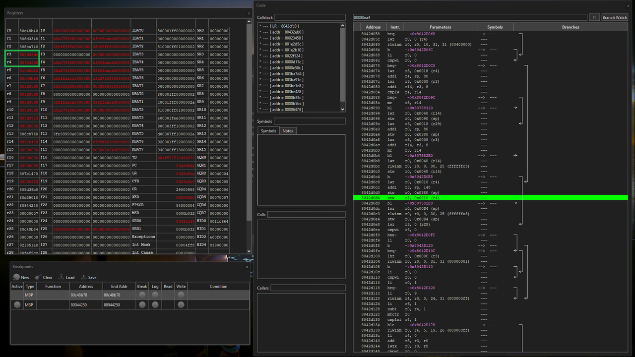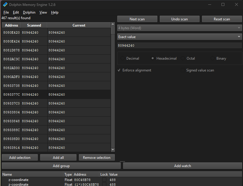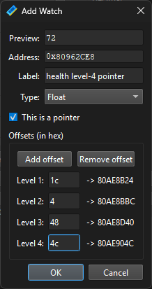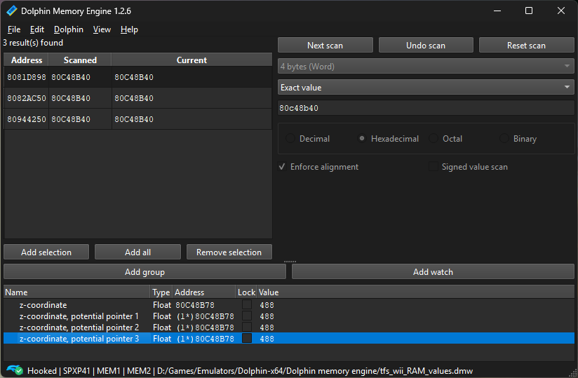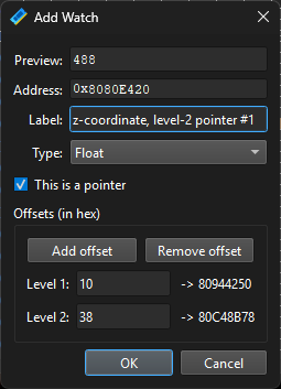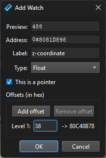 2.3. Find a base address With this, back to our breakpoint. The green line in the above image contains the command "stfs f1, 0x0038 (r28)". The offset of 0x0038 will become relevant later, but what we need for now is the "r28" part: register 28 at the time of that instruction holds the value 80c48b40 (cf. the green rectangle I drew in the Registers window in the image above) so what this instruction says is "store the float f1 at the address r28 plus 0038". As a sanity check, r28 + 0x0038 (so in our case 80c48b40 + 38 = 80c48b78) is in fact the address we are pointer-hunting for. Tip: while this particular hex addition was easy, for more involved computations I recommend this hex calculator). With this information we return to the Dolphin memory engine: we have to look for stable addresses which contain the value 80c48b40 from register 28. So start a scan for the exact 4-byte value "80c48b40" and select "Hexadecimal" below it, like so: Then click "First scan". Usually, you will get more than one hit, in which case you may want to narrow it down a bit. Resume the emulation ("Emulation > Play" in Dolphin) and click "Next scan" multiple times to get rid of anything that fluctuates (i.e., is unstable or was just random hits; after all, we want a stable base value). In our case, we got 8 initial hits: Of those, only three turned out to be stable—the others fluctuated or changed after a few seconds of gameplay: For our purposes, three hits is good enough and we can proceed to the next section. Even if you have way too many stable results you can move on to Sectoin 2.4. However, if you want to narrow things down further, you can repeat the entire process up until now on a different save (but keep your current Dolphin memory engine search): Find the base address which contains your value again, then set a memory breakpoint at that address, trigger the breakpoint, and enter the value of the corresponding register in Dolphin memory viewer's search field & click "Next scan". In theory you could repeat this until the number of hits does not change anymore. If one of your subsequent scans eliminated all addresses and you now have 0 hits, jump to section 3 ("Multi-level pointers") down below. 2.4. Stable-pointer check Now back to our example. We found three stable addresses: 8081D898, 8082AC50, and 80944250, meaning we can check whether any of them is a stable base for our pointer. To check this & to turn all this information into three pointers we do the following: First, copy each address (right-click > "Copy address"). Then open the memory viewer (View > Memory Viewer) and paste the address into the "Jump to an address" field. In the memory viewer, right-click on that address (in our case 8081D898) and select "Add a watch to this address". Alternatively, click "Add watch" in Dolphin memory engine and paste the address into the "Address" field. Then select the correct type of the value (in our case: float, because the coordinate in our game is a float) and click "This is a pointer". This will open an extra menu where you can add multiple levels of offsets. In our example, we currently only have one offset: 0x0038 (from the instruction in the "Code" window), so we only need a Level 1 offset where we enter 38: After clicking "OK" you should see a pointer in Dolphin memory engine's main window, signified by (1*) in front of the address because the pointer has one offset. Doing the same for all three addresses we found, we get the following list of pointers: If any of these pointers always points to the value you're interested in—even after loading different saves or restarting the emulator—then congratulations, you have what is most likely a stable pointer to your address & you are done! In our example, the third pointer seems to work consistently and reliably through different saves. If, however, all pointers you found throughout this section break at some point, we need to go one level deeper to pointers with multiple offsets. This is what the last section will be about. 3. Multi-level pointers What to do if none of the pointers we found in Section 2 are stable? In that case we have two options. The first one is simpler because it is mostly a repetition of what we did previously, while the second option is a bit more involved (but ultimately, potentially faster and more efficient). 3.1. Option 1: Rinse and repeat Let's assume the pointer from our example in Section 2 broke and we are now looking for a pointer with two offsets. What this means is that the memory address we want to find a pointer to is not our original address, but instead we want a pointer to one of the—at first glance stable—base addresses from Section 2.4. Translated to our example, we now want to find a pointer to the address 80944250 (from Section 2.4)—which, if successful, will become a two-level pointer to the original address 80C48B78. First, load your savestate and repeat the entire process from Section 2, but now for the memory address 80944250 from Section 2.4.: Set a write-memory breakpoint at 80944250, resume emulation, trigger the breakpoint, and look at the green instruction in the "Code" window. The highlighted instruction reads "stw r3, 0x0010 (r4)" which means "take the value from register 3 (80D48420) and store it in the address from [register 4 (80944240) plus offset 10]". (Note that the instruction will likely look different from the instruction in Section 2.1., so recall the syntax of these instructions from Section 2.2). But this instruction is problematic because it does not pass our sanity check: although "register 4 plus offset 10" = 80944240 + 10 = 80944250 = the address we are trying to find a pointer to (this is good), the value in register 3 (80D48420) plus our first offset (38) is 80D48458, which is notably not the address of the original z-coordinate (80C48B78)—this is bad. What this means is that this instruction is setting that slot for some other object/context, meaning it is not relevan