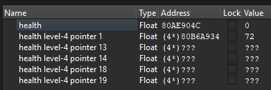 For the first task, we have to set a breakpoint at that very instruction ("lwz r7, 0x001C (r3)"). This is done by scrolling up to it and clicking to the left of the address of that instruction (in our case: left of the address "80080ea4" in the Code window). Things should look like this then; a blue point in the Code window and one active breakpoint in the "Breakpoints" window: Resume the emulation ("Emulation > Play" in Dolphin) and trigger a change to your value (in our case: health so we again have to get hit or heal). If done correctly, the emulator should pause and the instruction where you set the breakpoint should now be green in the Code window: From the register we read that r7=80810000 and r3=80ae8b08 at the time of that command, so what the highlighted instruction says is "read the 4-byte value from memory at r3 + offset = 80ae8b08 + 1C = 80AE8B24, and store that value in register 7". Recall that we already knew what this instruction said, but the crucial new information is the value in r3: 80ae8b08. This value we can now search for in Dolphin memory engine: After removing all breakpoints, resuming the emulation for a bit, and removing all unstable values (by pressing "Next Scan" multiple times), we are left with 20 values that we can try out. For this we use the same procedure as at the end of Section 3.1.: copy one of the stable addresses, add a watch, paste the address into the "Address" field, set the type, and check "This is a pointer". The offsets we enter now are the offsets we noted down earlier (from the command chain), in our case: first 1C (because that's the offset on the command we set the breakpoint on), then 4 (the offset of the following command), then 48, then 4C. Click "OK", then repeat this for as many addresses as you want to try out as base address for the level-4 pointer. The final step is again to test stability of the pointers you found throughout loads and emulator restarts. In my case, of these 20 pointers only the very first one survived, but that particular one seems to indeed be stable so this example has been brought to a happy end: It could of course happen that none of the pointers you found are stable. In that case, repeat the whole breakpoint procedure, but with a different command from the chain of instructions that you identified.