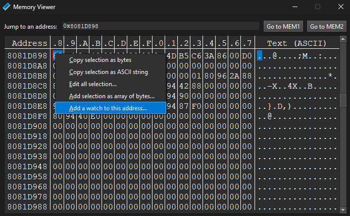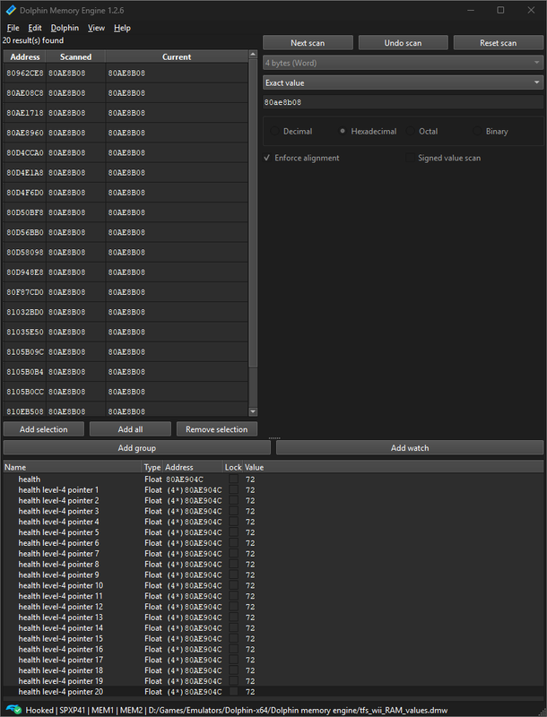 Here, the game paused after I added a breakpoint to the HP address as I just took damage. The interesting part is the instruction it broke, in this shot, it broke with the following instruction: sth r0, 0x0120 (r30) st means store (write), l means load (read) and whatever follows tells you the type (h means halfword or 2 bytes, b means a single byte, w means word so 4 bytes and f means float). If you see letters after that, it's just some parameters that you usually don't care about, but you can google it with the keyword power pc instruction, you should get something. The only other letter you might care is i meaning immediate aka, it loads / writes a constant. The first parameter of all of these is where it reads into / where it writes from so you usually don't necessarly care about it. What you are most interested is the second and third parameter, the third is what base address it loads from / write to while the second is the offset to apply to said address (so if the address is 0x80000000 and the offset is 0x10, it means it's going to laod from / write to 0x80000010). Sometimes, direct numbers will be displayed, but other times, you will see registers like here, we see r30 meaning whatever is curently in r30, to know this, refer to the register view. Here. we see that the game stores 2 bytes located in the address of r0 to the address in r3 + 0x120. It's important you get how to parse these in your head. The next step is to actually scan for a 4 byte hex number that contains that base address, we already have an offset so just take note of it. r30 in this shot was 0x812f72c4 so whatever address the pointer is, its value is 0x812f72c4, this is something the RAM search can query easilly. However, one scan is likely not enough so what you have to do is make the pointer change path (so in this example, laoding another level is enough), find the new address and repeat the memory breakpoint process, this time, you will get a different address, scan for that in the scanner. Narrow down the address this way. There is a chance that the result will be your base address so enter THAT new address in the watch, check "This is a pointer" and enter the first offset you got before, if it was a simple level 1 pointer, congratulation, you found your first pointer which will not break whenever the location change. If however it still changes, you simply redo the process, but with the newer address (so check what reads or writes to the base address you got in the scanner blah blah blah). You may have to do this a couple of times depending on how deep the pointer is, but the good news is usually, pointers path will be similar for the same game, only some offsets may vary. It is an involved, but necessary process to get the path you want, in fact, what CE does for PC games is it handle this automatically, but this isn't something very feasible with an external RAM search and Dolphin provides the tools to allow you to do the exact same process anyway. So if you REALLY want to start to find pointers, I suggest you take some time to learn this process, it's going to be very usefull. Other things I need to repeat this, but this is a BETA release, not everything that I plan to do is there and not everythign works perfectly (mainly about the GUI, I know, it is clunky at times) and it may have some bugs, but the idea is consider this a preview. It works, you could in theory start to use it over CE right away, but just know, it's not STABLE. It does have file saving support however, use the file menu for that, your watch list is going to be saved with a .dmw extension (Dolphin memory watches), but it's just JSON, you can edit it manually using a text editor. I did tested it quite a lot during developpment so I can at least say it should work most of the time. If somethign wrong happens, feel free to talk about it in this thread or private message me (or even tag me on irc/discord, I am always there and I check my stuff), or post an issue in the issues tab of the Github page, I accept bug reports and features request there. The result count will differ from CE for mainly 2 reaosns: 1: I do not use alignement because it's not guaranteed that the GameCube and Wii have aligned address, they support unaligned ones. I might add the option anyway, but for now, I just want to see the impact of disabling it. CE by default enalbles it, but you can disable it. 2: if you are scanning float with the filter bigger than or smaller than, it will give slightly more results than CE, this is because CE scanner has a minor bug where it discards infinite numbers which is technically wrong, you can compare these. Keep this in mind if you plan to compare. Oh and for performance wise, it's similar, however, you might want to watch RAM usage, it can get up to something like 250MB - 300MB if you scan a wii game with MEM2 enabled, this is normal, but as soon as you are done with the scan, click reset, it will free the memory. The usage is 2-3 times lower for MEM1 disabled scan and it's almost nothing without any scan (maybe like max 20MB). To put groups or watches into groups, just drag them into the group. To delete, use the delete key. Rest should be self explanatory like double click to edit. Finally, the signed value scan allows you to take the sign into consideration so that -1 is lower than 1 for example. Only check this if you care about negative values and scan for integers (floating point types always take care of the sign). EDIT: As of version 0.2, it now has a memory viewer, here's a screenshot of it: