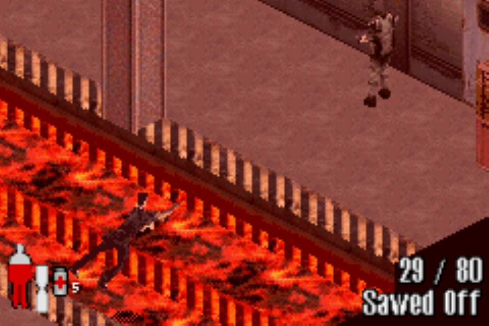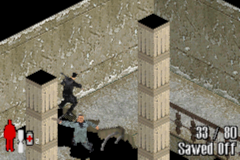 Max Payne is a third-person shooter from 2001 by Remedy Entertainment, which later became a well-known and beloved trilogy. Far less known, however, is that the original Max Payne also received a Game Boy Advance port, released in 2003 in the US & 2004 in Europe (known there as Max Payne Advance). While the story is the same, the gameplay is quite similar across ports, and all levels from the GBA port are also in the PC version, the biggest difference is the player’s perspective. While the PC port is a 3D shooter, the GBA game uses an isometric perspective which takes quite some time getting used to—more on this in the “Movement” section below. Also, like the PC port, Max Payne Advance is divided into three parts; however, because of the hardware limitations the GBA version has less levels (12 in total).