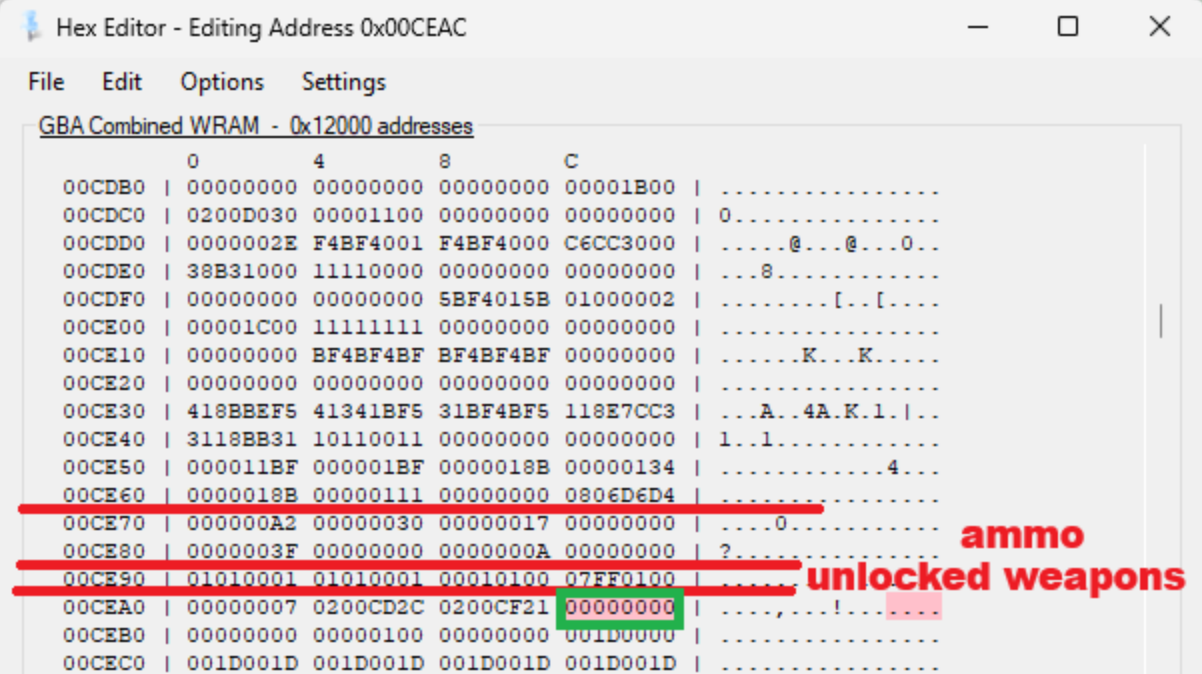 With this in mind you may already see how you can abuse this system using animation cancelling: pressing L interrupts the current animation so if you do that between “the third byte is set to one” and the attack finishing, that byte keeps the value 1. But then if you change to a weapon that has no ammo left, because the third byte is still 1 the game interprets that as “all checks were cleared, this weapon is allowed to shoot”.